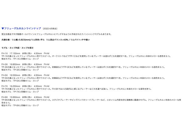 ■特徴:TP-7Xの基となったフリューゲルホルン用マウスピース。FH-9Xでは小さ過ぎると感じるプレーヤーはこれを選べば良い。フリューゲルホルン本来のメローな音色を持つ。