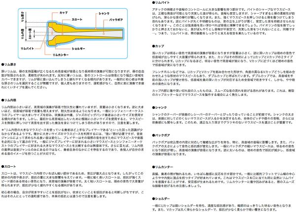 楽器ごとに統一されたリム形状なのでサイズやカップの深さなどが違ってもリムが合わないといったことはないです。またトランペット、コルネット、フリューゲルホルンの3種類に同じリム形状を採用しているため持ち替え時も同じような口当たりで演奏が可能です。