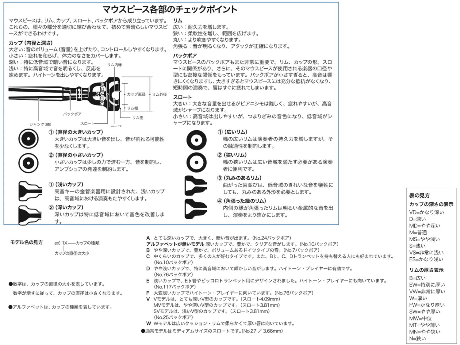 厚いリムは、唇の支持面積が広 くなるため高音域が容易となり長時間の演奏が可 能になりますが、唇の自由度が制限される分、柔軟性が失われます。反対に薄いリムは、音のコントロールは容易になり幅広い音域をカバーできますが、リムが 唇に食い込んでしまうと疲れやすくなる傾向があります。一般的に初心者は中庸な厚さのリムを選択することが無難ですが、個人差もありますので、違和感がな く、自然に楽に演奏でき疲れにくいタイプを選んでください。