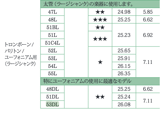 SL-48L リム内径 25.25mm スロート径 6.62mm 特徴:非常にバランスの良いリム・カップに細めのバック・ボアを持つ。プロの演奏家の高度な要求にも応える能力を持ち完成度が高い。