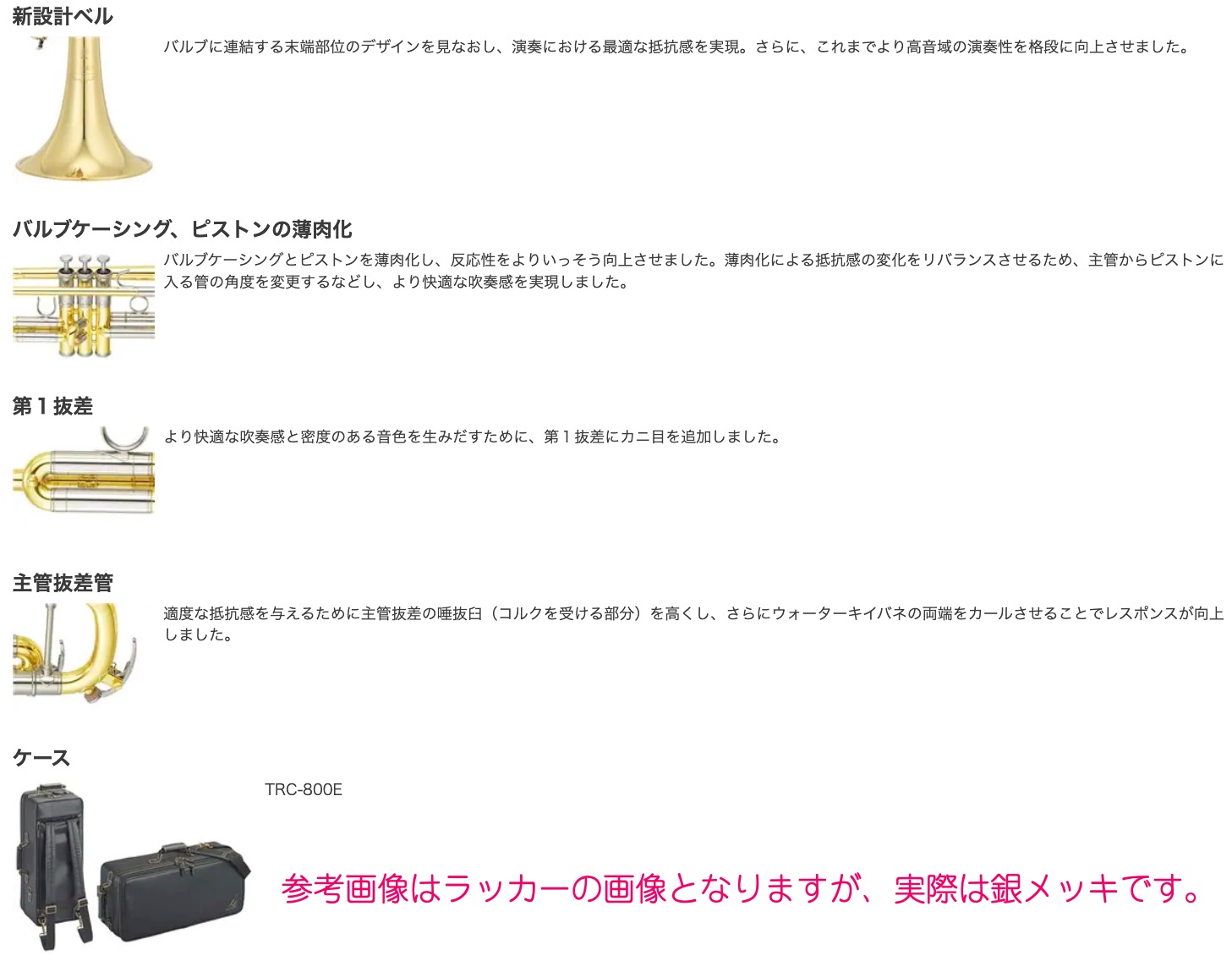 ・新設計ベル:バルブに連結する末端部位のデザインを見なおし、演奏における最適な抵抗感を実現。さらに、これまでより高音域の演奏性を格段に向上させました。