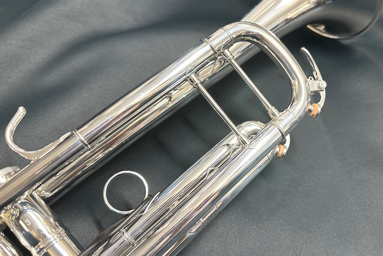 ・2本支柱:支柱はトランペットの音色や響きに重量感を加えるために立てられているパーツです。けれども、これを立てることによって、楽器を吹いたときの感触はかなり変わります。(支柱なし:明るく、抜けがよい。軽い音色。/支柱1本:豊かだが、ある程度の抵抗感。/支柱2本:かなりの抵抗感があり、重い音色。)