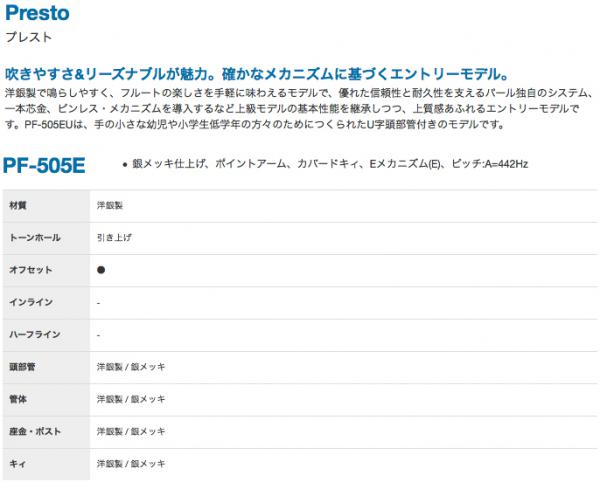 プレストのラインナップ ・PF-505E...ストレート頭部管、カバードキイ、C管、Eメカ付き。いわゆる一番スタンダードで安いものです。ヤマハでいうとYFL-212と同等仕様です。 ・PF-505EU...U字頭部管、カバードキイ、C管、Eメカ付き。例としてヤマハにはU字のみのものがありません。その分パールの方が安く手にはいります。 ・PF-505EUS...ストレート頭部管+U字頭部管、カバードキイ、C管、Eメカ付き。ヤマハでいうとYFL-212Uと同等仕様です。 ・PF-505RE...海外流通モデル。弊社特注品。ストレート頭部管、リングキイ、C管、Eメカ付き。ヤマハにはこの価格帯のリングキイはありません。 ・PF-505RBE...海外流通モデル。弊社特注品。ストレート頭部管、リングキイ、H管、Eメカ付き。ヤマハにはこの価格帯のH管もH管リングキイもありません。