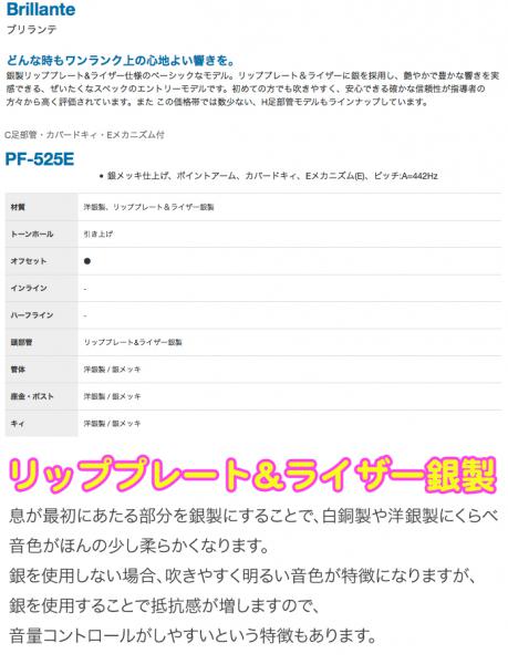 ブリランテのラインナップ ・PF-525E...ストレート頭部管、カバードキイ、C管、Eメカ付き。ヤマハでいうとYFL-212LRS同等品です。 ・PF-525RE...ストレート頭部管、リングキイ、C管、Eメカ付き。ヤマハにはこの価格帯のリングキイはありません。ヤマハの一番安いリングキイはYFL-372(オフセット)、YFL-382(インライン)となり頭部管銀製からになります。 ・PF-525RBE...ストレート頭部管、リングキイ、H管、Eメカ付き。ヤマハにはこの価格帯のH管もH管リングキイもありません。一番安いものでもフィネスから上のモデルになりますので定価で30万近い価格からのラインナップです。