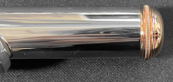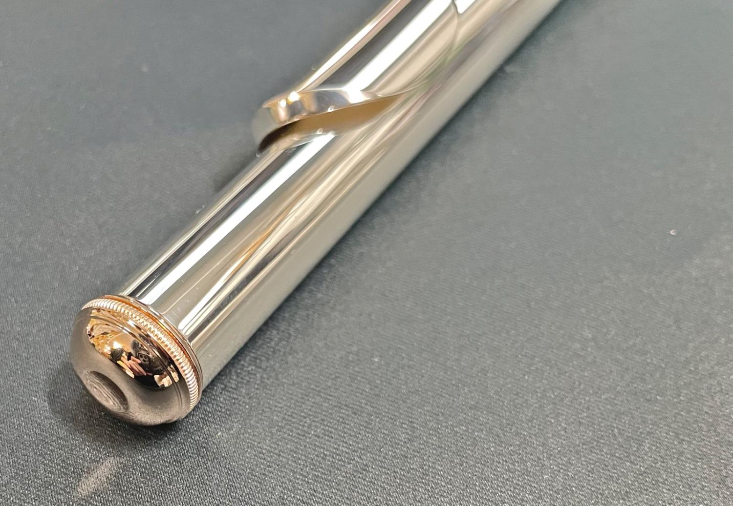 安いフルートは主に洋白(白銅)を素材としており、上位モデルにいくほど銀を使用している部分が多くなります。シリーズのラインナップによって使われる銀の部分が多くなるのがお分かりいただけるかと思います。素材、メッキは音を出す上で大きな影響があるもので、さらに口元に近い部分はよりその影響が強いとされています。ですので、銀、金が使われるのはリップ/ライザーからはじまり徐々に広がってきます。この素材の違いが響きや音質に関わる重要な部分ですが、銀や金を使用することで同時に抵抗感を感じられることになります。