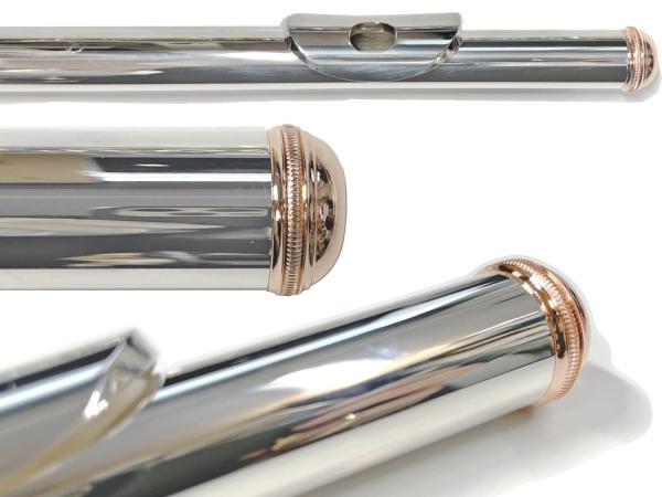 フルートのメカニカルオプション以外の価格の違いは、主に素材であり、それぞれ材質ごとに異なる音の特性を持っています。低価格の一般的な製品は大部分が白銅が用いられており、上位モデルにいくほど口元に近い部分から銀の範囲が広がっていきます。