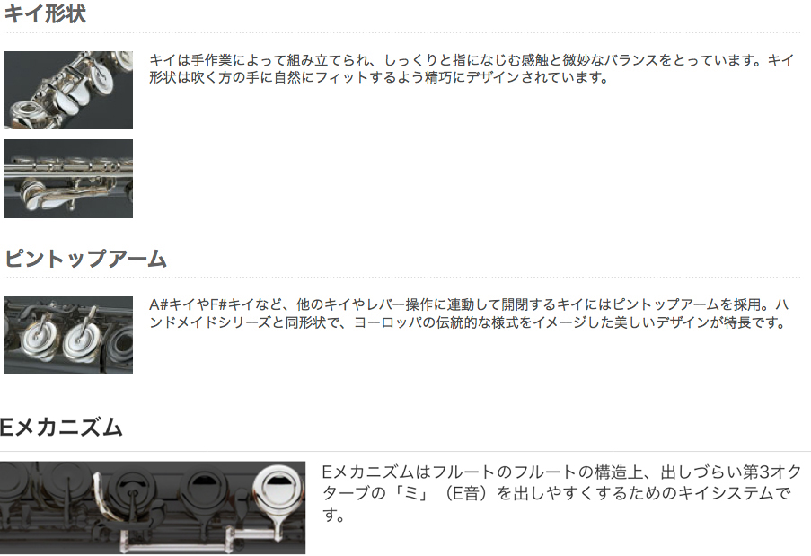 ・Eメカニズムとは:フルートの構造上、出しづらい第3オクターブの「ミ」(E音)を出しやすくするためのキイシステムです。 E音は古典派やロマン派の美しい旋律や、現代曲の技術的に高度な作品にも多用され、Eメカニズムは極めて有効なシステムといえます。