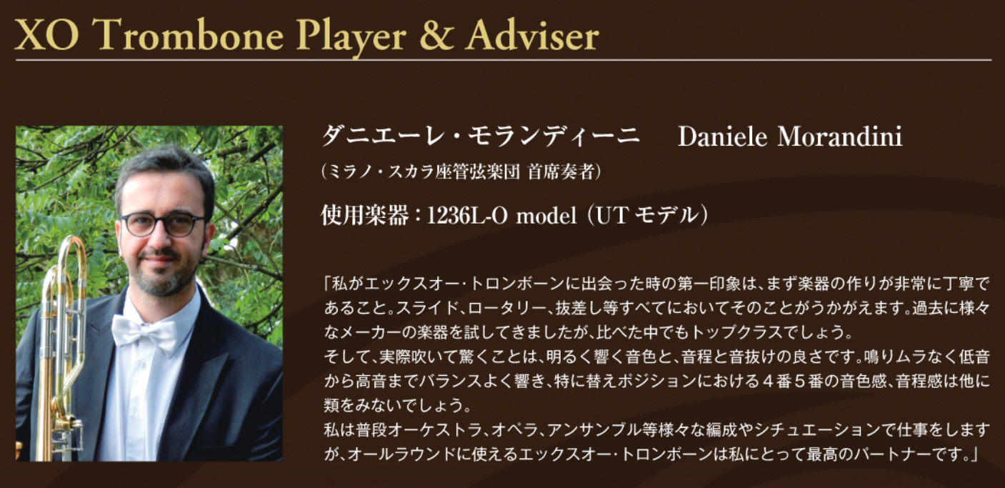 【別ラインナップ】 アキシャルフローバルブ:1970年代にアメリカのエド・セイヤー氏が考案したいわゆるセイヤーバルブといわれる円錐型のバルブシステム。XOのシステムはエックスオーのオリジナルのものとなります。ロータリーバルブよりも息の流れがスムーズで抵抗感が少なく吹きやすい。どの音域でもムラのない吹奏感が得られます。あえてこのシステムの短所を上げますと表面積が多くなる故、気密性が悪いなどとも言われますがXOトロンボーンは気密性にも優れています。またこのように言われているのは通常のものに慣れた奏者がまっすぐに息が入る抵抗感の少なさからこのように感じられることもあるかもしれません。