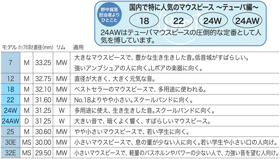 【モデル】【カップの深さ】【直径】【リム】【特徴】 No.7 M 33.25mm MW 大きなマウスピースで、豊かな生き生きとした音。低音域がすばらしい。強いアンブシュアの人に向く。Lボアの楽器に向く。 No.12 M 32.75mm MW 直径が大きく元気な音。 No.18 M 31.30mm MW ベストセラーのマウスピースで、多用途に使われる。 No.22 M 31.60mm MW No.18よりやや小さい。スクールバンドに向く。 No.24W M 31.25mm W 多用途に使え、生き生きとした音。スクールバンドに向く。 No.22AW D 31.25mm W 大きい音で、暗くよく響く、すばらしいマウスピース。 No.25 M 30.60mm MW やや小さいマウスピースで、若い学生に向く。 No.30E MS 30.00mm MW 小さいマウスピースで、息の量が少ない人に向く。若い学生や小さい口の人向け。 No.32E MS 29.50mm MW 小さいマウスピースで、軽量のバスホルンやパワーの少ない人で力強い音を望む人向け。