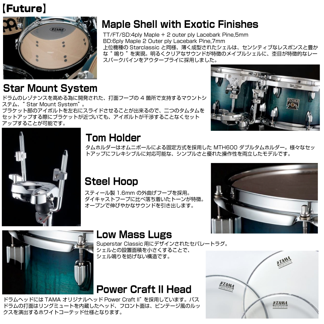 "Superstar Classic" はオールメイプルシェルのドラムセット。"Superstar Classic" はオールメイプルシェルのドラムセット。 薄く成型されたメイプル材のシェルは、どんなチューニングにも繊細に反応し、心地よい音抜けと、明るくクリアーなサウンドを奏でます。 また、フープには外曲げのスティール製フープを採用し、メイプル材の持つオープンで伸びやかなサウンドを更に引き立てます。タムの深さは、少し浅めのサイズを採用し、フィルインでの表情を付けやすく、また、バスドラムの上にマウントした際の高さのセッティングに幅を持たせられるような仕様にしました。