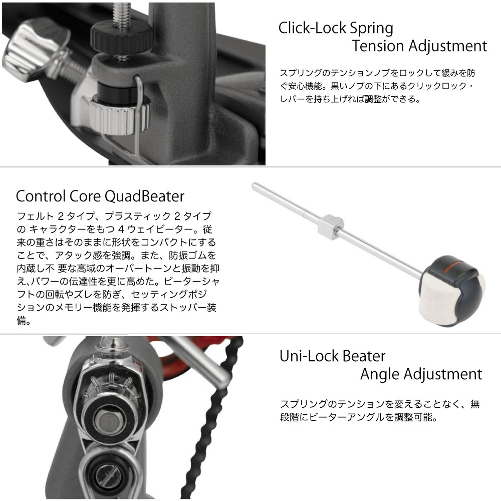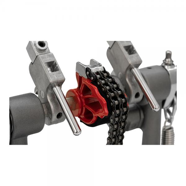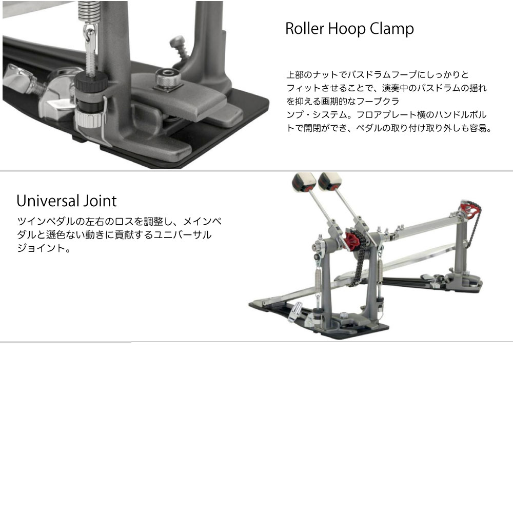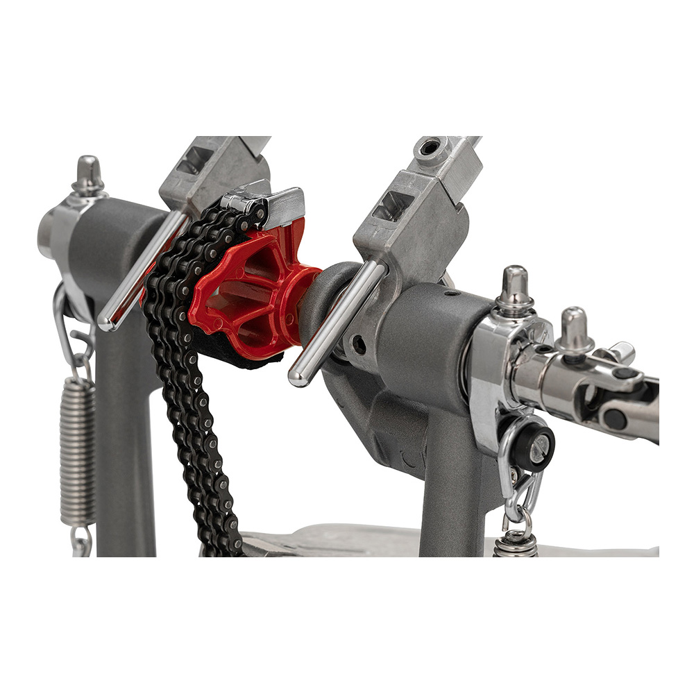 “Eliminator: Redline Chain Drive”ドラムペダルのYoung Brother。クリックロック・スプリングテンション調整機能、パワーシフター、ローラー・フープクランプ・システムなどの機能はそのままに、“Redline”ドラムペダルでUSA一番人気のレッドカムと同サイズの偏芯ホイールを採用したモデル。フラットコンセプトでシンプルデザインのフットボードは、ニュートラルな状態でのフットワークが可能で、コストパフォーマンに優れているのも魅力。ツインペダルは、左右のロスを調整するドライヴシャフトの採用で、サブペダルでもメインペダルと遜色のない動きに貢献する。
