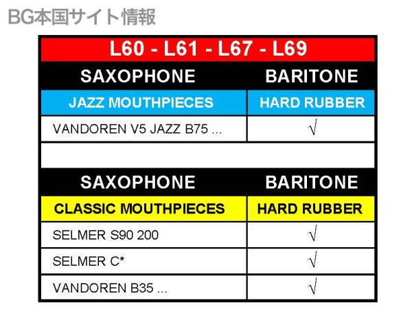 ▼BG金属製リガチャーラインナップ(バリトンサックス) ■エボナイト、ハードラバー製マウスピース用 ・Tradition(トラディション)...リードにはレールのみで接するタイプのメタル製リガチャー。音の遠達性に優れ、華やかで色彩感のがあり、ストレートかつ豊かな音色が魅力。 仕上げラインナップ...銀メッキ(L47)、ゴールドラッカー(L40)、ローズゴールドメッキ(L49)、ピンクゴールドメッキ(L40PGP)、24K金メッキ(L41)