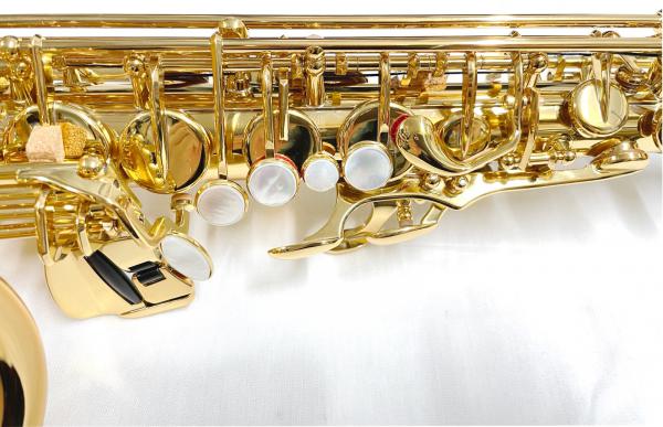 ヤマハのラインナップにはクリアラッカー仕上げはありませんがサックスや金管楽器の仕上げではよく使用されます。YAS-875EXはゴールドラッカー仕上げです。銀メッキ仕上げの楽器に比べて抵抗感が強くなく、初心者の方には吹きやすいです。