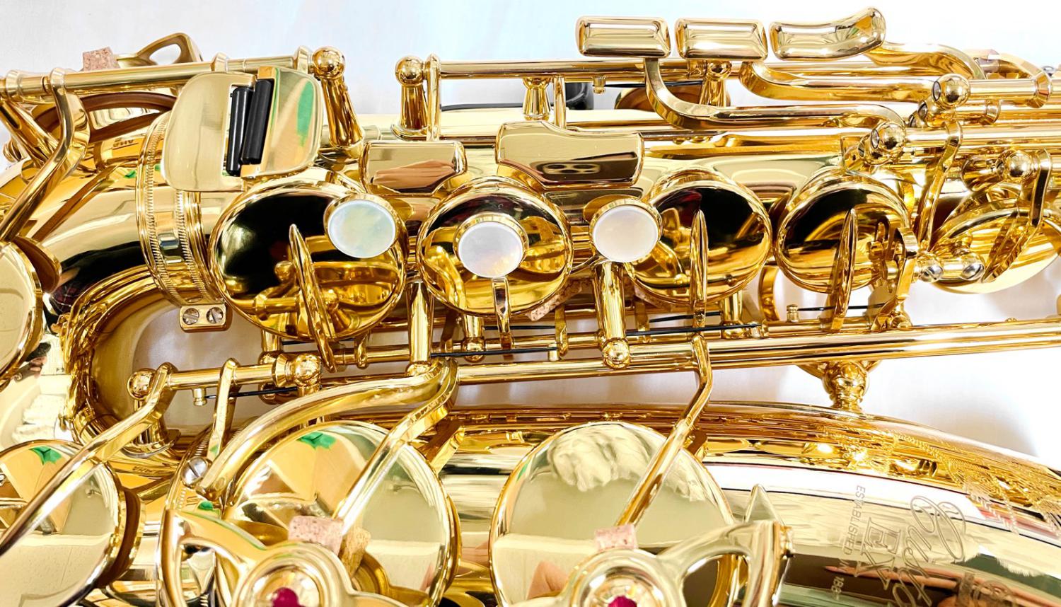 ヤマハのラインナップにはクリアラッカー仕上げはありませんがサックスや金管楽器の仕上げではよく使用されます。YAS-875EXはゴールドラッカー仕上げです。銀メッキ仕上げの楽器に比べて抵抗感が強くなく、初心者の方には吹きやすいです。