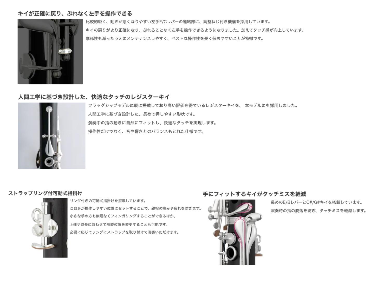 キイの戻りがより正確になりぶれることなく左手で操作が可能に、またタッチ感も向上。摩耗性も減ったうえにメンテナンスしやすく、ベストな操作性を長く保ちやすいことが特徴。