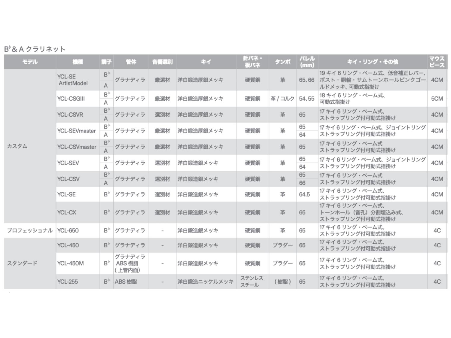 ヤマハクラリネットのキイは以下のラインナップ。ニッケルメッキのものはYCL-255のみ、また洋白鍛造厚銀メッキはカスタムの中でも上位モデルに使用。