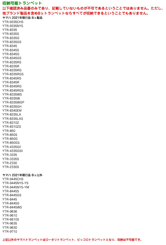 以下確認済み品番のみであり、記載していないものが不可であるということではありません。ただし、他ブランド製品を含めB♭トランペットならすべてが収納できるということでもありません。