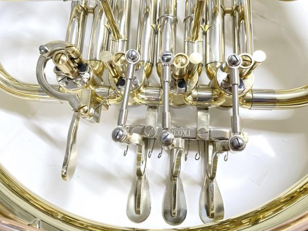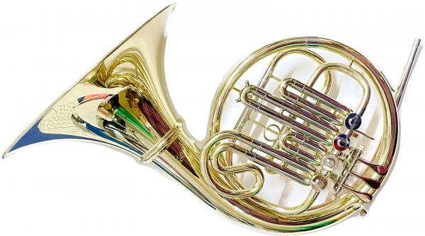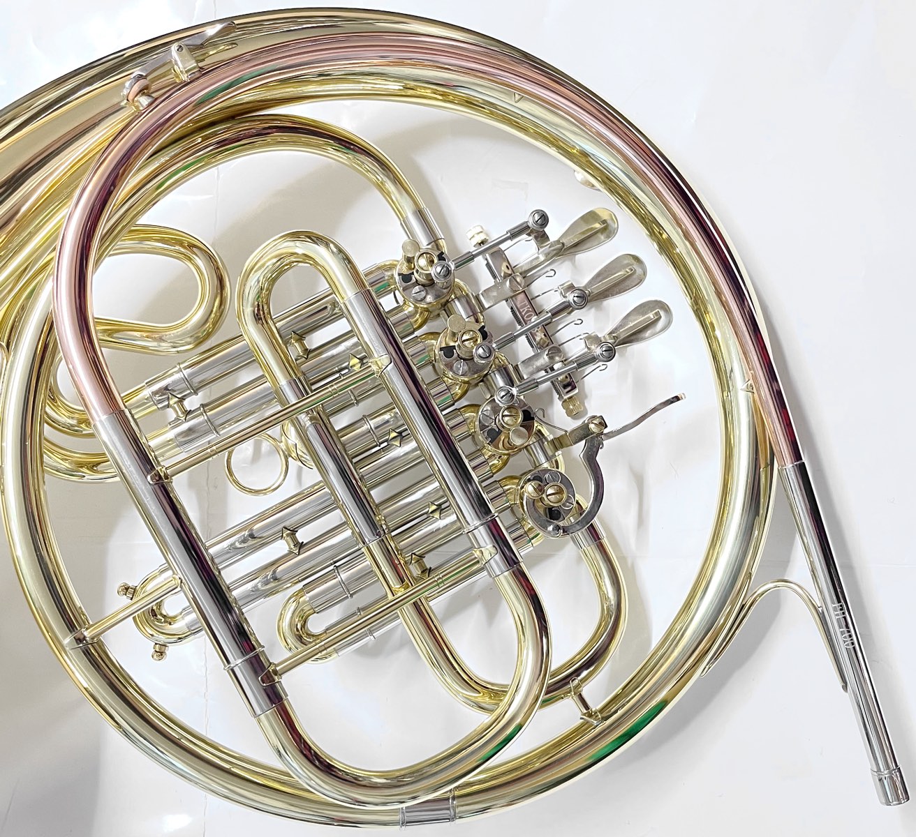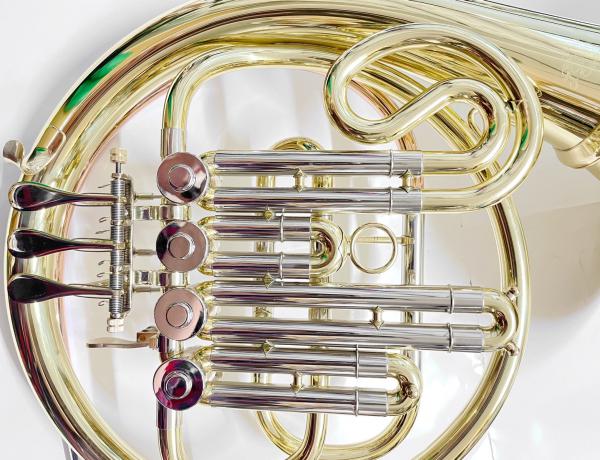 上記2つの調の管が1つになった楽器です。F管とB♭管の組み合わせが一般的で入門者でも先のことを考えこちらから使用することもあります。それぞれ独立した2つの調性をバルブで切り替えることができます。シングルに比較して音程、音色、正確性、パワーなどをレバーひとつで切り替えることで臨機応変に使い分けが出来るのですが操作性が良いということはそれだけ使用する管もパーツも多くなりますので、重さがあります。フルダブルが多く使われますが、「セミダブル」というものも存在します。同じ音域ですが、全体の管の長さが少し短いセミダブルにはB♭管と、B♭管につなげてF管に出来る補正管(迂回管)がついておりフルダブルより音の出る構造が短くなります。吹奏感は異なりますし、楽器の重さもそれだけ軽くなります。(シングルほどではない)ただしデメリットもあり、低いFの音を出す時にはF管のバルブセクションを通った後、B♭管のバルブセクションも通ることになり、管の中の凹凸を多く通る分、音が影響を受けます。