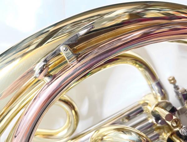 こちらはB♭シングルです。 ベル、管体はイエローブラス。この機種での仕上げラインナップはありませんが、管楽器には仕上げがいろいろあり、見た目だけではなく音色に違いが出てきます。こちらは輝かしく明るくはっきりとした響きが特徴のゴールド。ホルンはゴールドが一般的に好まれる傾向です。奏者の手に合わせて調整が可能な第4レバー付き。