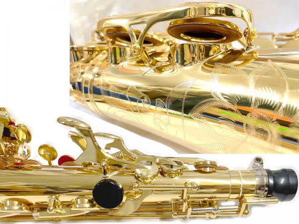 ヤマハのラインナップにはクリアラッカー仕上げはありませんがサックスや金管楽器の仕上げではよく使用されます。YAS-82Zはゴールドラッカー仕上げです。銀メッキ仕上げの楽器に比べて抵抗感が強くなく、初心者の方には吹きやすいです。