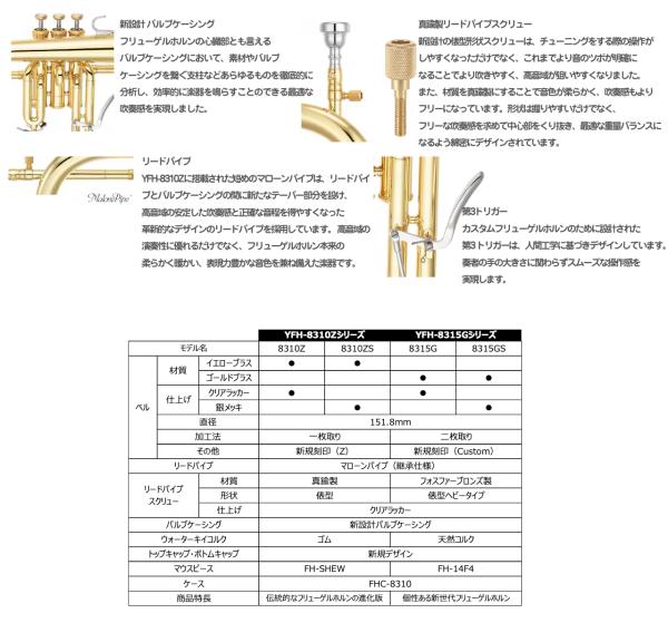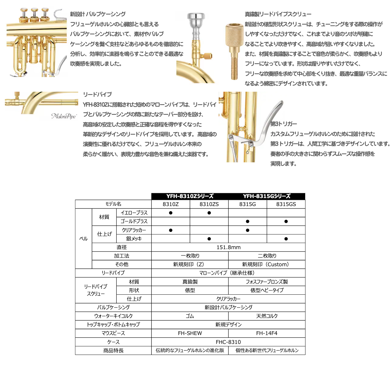 YFH-8315G、YFH-8310Zはどちらも吹奏楽、ジャズシーンでも使用できるモデルです。どちらかというと軽い吹奏感、輝かしい明るめな音色が好みの方はYFH-8310Z、抵抗感がある吹奏感、暖かい深みのある音色が好みの方はYFH-8315Gがあっているかもしれません。