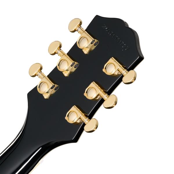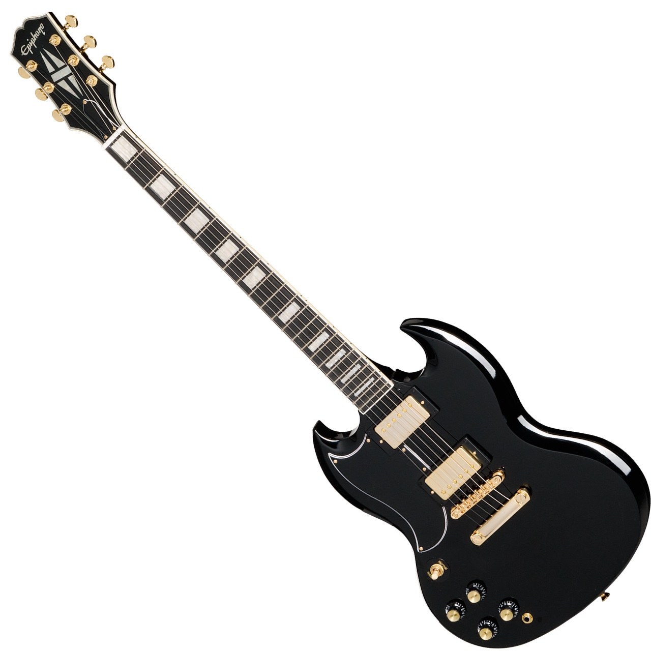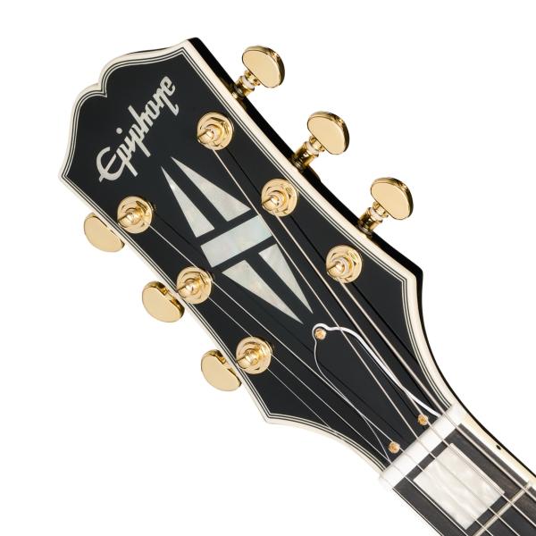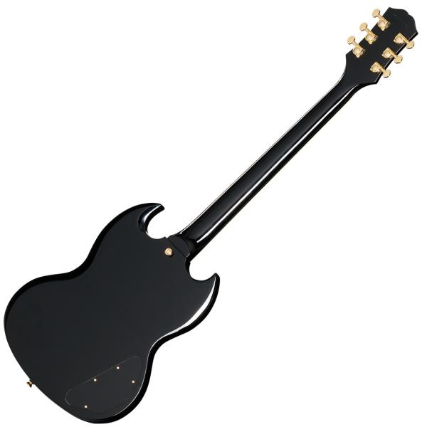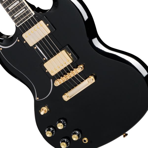 生産数は少ないもののレギュラーラインナップのレフトハンドモデル。ちょっとレアなSGカスタムです。お見逃し無く SGは多様なジャンルのミュージシャンから長きにわたって愛され続けてきました。レス・ポール氏本人によって考案された、レスポールの高級感溢れる“タキシード”バージョンである「カスタム」と同様に、SGカスタムはギブソンの「カスタム」モデルに共通するプレミアムな仕様を纏っています。エレガントかつフォーマルな外観に加え、奏でられるリッチなサウンドはプレイヤーと観客の両方をともに魅了します。 SGカスタムはギタリストにフィットするコンター加工付きのボディを持ち、ダブル・カッタウェイにより22フレット全てのポジションへの容易なアクセスを実現しています。セットネック方式でジョイントされたネックは、SGの高いサスティン特性に寄与しています。ネックシェイプは1960スリム・テーパー Cプロファイルが採用され、通常のスリム・テーパー・シェイプより厚みがありながらも素早い滑らかなフィンガリングを可能にします。ミディアム・ジャンボ・フレットが打たれたエボニー指板にはパーロイド素材のカスタム・ブロック・インレイが施され、12インチの指板R(ラディアス)採用によりロー・ポジションでのコード・プレイやハイ・ポジションでのベンディングの両方をストレスなく行えます。バインディングが施されたヘッドストックにはマザー・オブ・パール素材で作られたEpiphoneロゴとカスタム・スプリット・ダイヤモンド・インレイが装飾されています。Grover Mini Rotomaticチューナー、Graph Techナット、Epiphone LockTone Tune-O-Maticブリッジ、Stop Barテイルピース等の採用により、安定したチューニングと正確なイントネーションをギタリストにもたらします。ハードウェア類は黒のトップハット・ノブのインサート部分に至るまで、すべてゴールド色で統一されています。