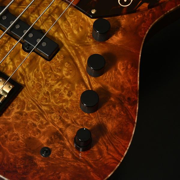 マーブルウッドは「黄金樟」とも呼ばれる東南アジア原産の非常に希少な木材で、特有の美しい瘤杢(バール)が特徴的です。ボディ本体に使用したアフリカンマホガニーはミッドレンジの強調された粘り気のあるサウンドが魅力です。