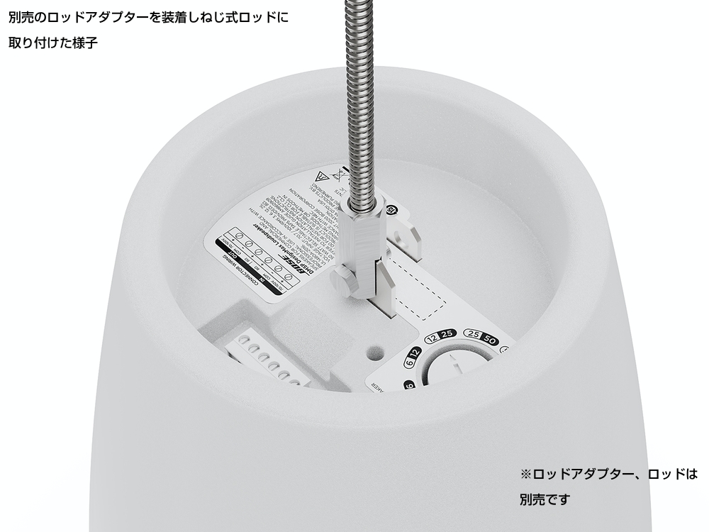ペンダント型スピーカーには、金具部分や保守用の余長を隠せるくぼみ形状のシングルポイントサスペンションシステムを採用。設置後の見た目を気にせずにケーブルの余長を保持できることで、設置作業も容易に行えます