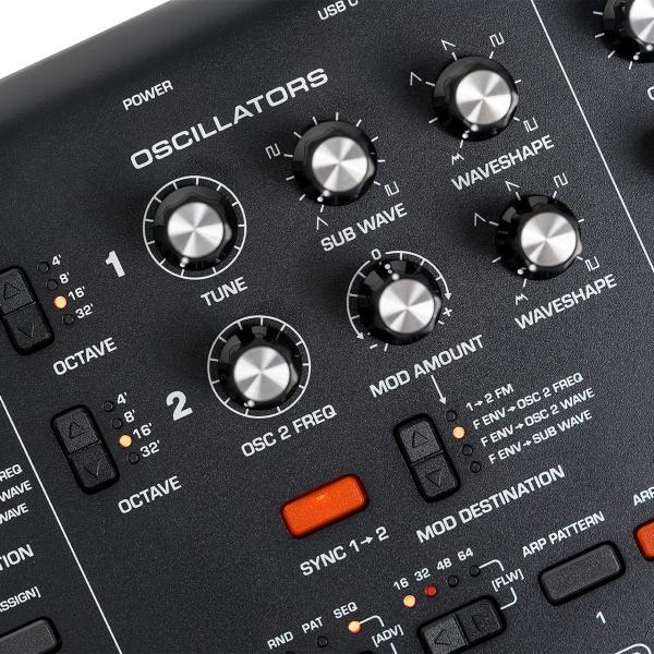 コンバクトなサイズながら迫力のサウンドを生み出すMessenger は、ウェーブフォールディング機能を備えた2 基のオシレーター、連続可変のウェーブシェイプを持つサブオシレーター、ルーブ対応のADSR エンペロープを2 基、ベロシティとアフタータッチに対応した32鍵のフルサイズ・セミウェイテッド鑓盤、そして高いレゾナンス設定にしたときの低域補償や複数のフィルタースロープ、マルチモード動作に対応した伝説的なMoogラダーフィルターを搭註しています。