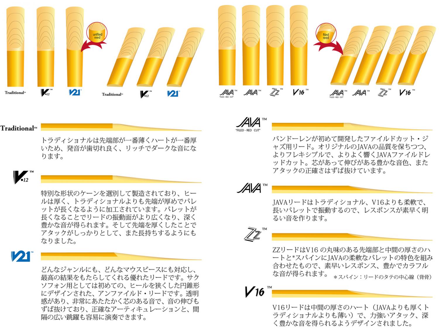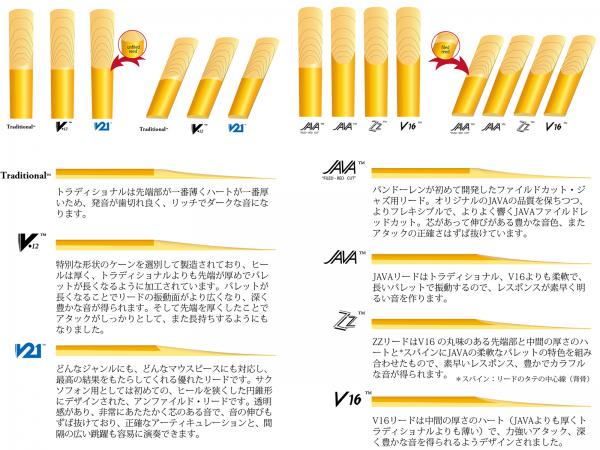 定番のスタンダード。長年にわたって高い評価を得ている一番幅広く使われているリードです。非常に薄いティップからきわめてピュアな音質が生み出されるよう にデザインされており、また振動する部分のコシが強くJAVAやV16よりもパレット(最大限に振動する部分)が厚くなっています。