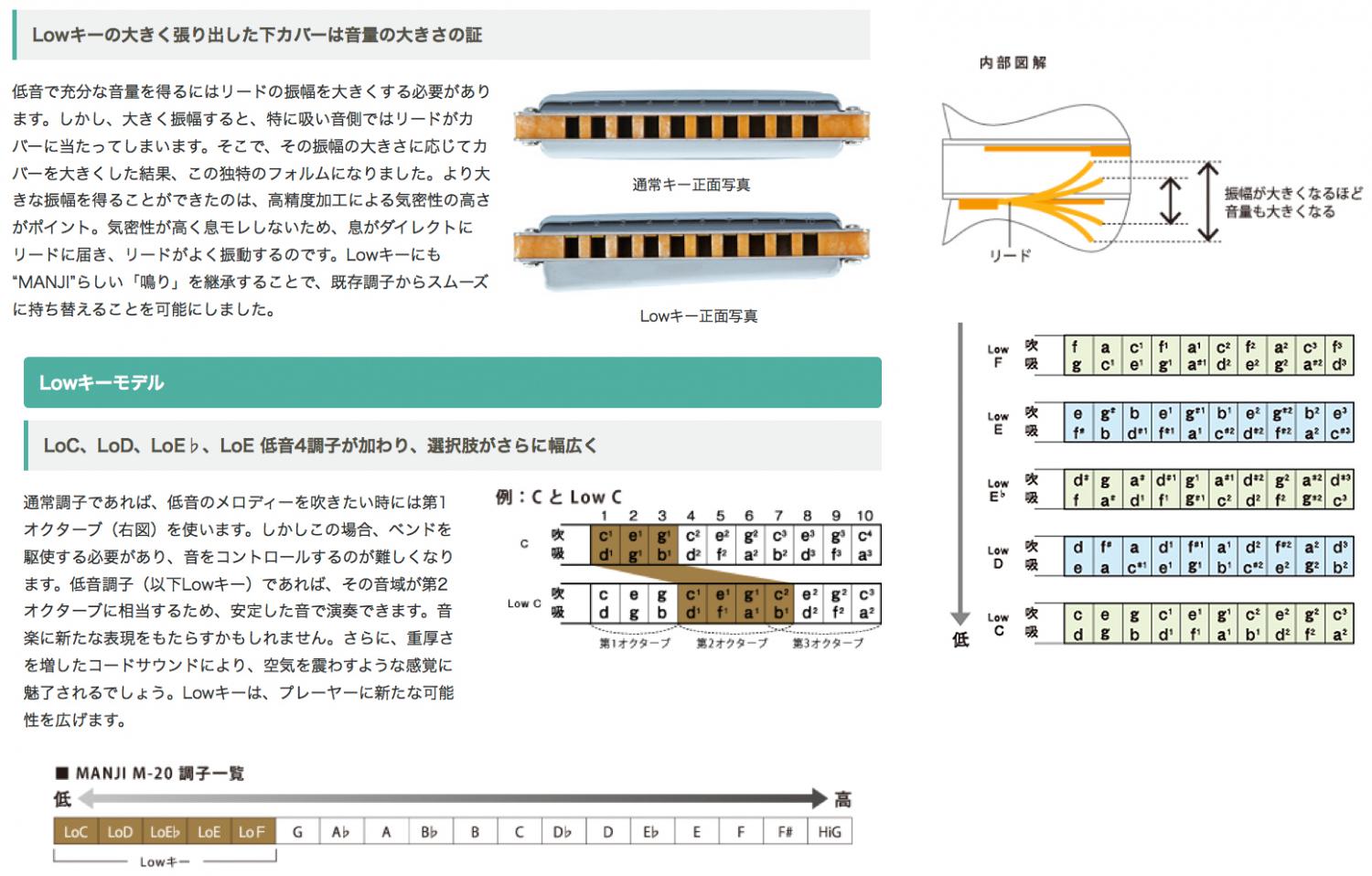 鈴木ハーモニカの中では比較的新しいラインナップのテンホールズハーモニカ。ボディは木製の音色を持ち、プラスチックの吹きやすさと耐久性を兼ね備えた新素材。50%は天然木繊維から組成されています。暖かい音色を生み出す木素材には、水や養分を吸い上げた無数の小さい空間が存在します。それと同様にこのボディもまた、内部にその構造を再現しています。(※断面図)天然木繊維によって強化されたソリッドボディは通常のプラスチックボディとは異なるしっかりとした音を作り出し、ボディ自身が音を伝えるためハーモニカ全体がうなるようなサウンドが特徴です。もちろん樹脂との合成の為、水分による変形などの問題は無く、木部の変形に悩まされることもありません。またカバーはブルース・ロックハーモニカ奏者の要望に答える、背面が全て開いたカバースタイル。様々な角度からの音の流れもデザインされています。サイドにも大きなサウンドホールを設け、演奏者に最適な音の返りを与えます。プロプレイヤーと試行錯誤を繰り返し、伝統的なカバー形状に絶妙なホールド感と音抜けを実現しています。リードプレートは研究、技術、設備により誕生したリードプレートです。リード弁とプレート窓の取付精度を限界まで高めたオーバーブロウにも定評のあるこのプレートはダイナミックレンジの広い粘りのある音が特徴。さらに、吹き込むほどに演奏者に唄うように答えてくれます。 SUZUKI MANJI M-20 Blues Harmonica スズキ マンジ テンホールズハーモニカ M20