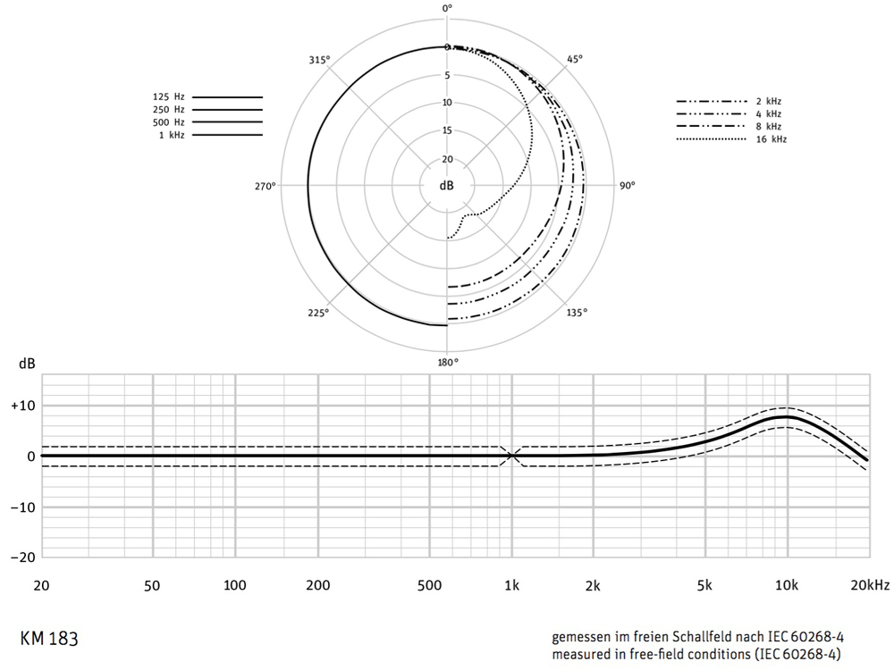 KM 183 は無指向性のマイクロフォンで、拡散音場でもリニアな応答特性になるよう均一化されています。自由音場では10kHzで約7dBの高域のブーストが行われます。圧力トランスデューサーのKM183は、近接効果が発生せず、事実上無制限のリニアな低域応答が可能です。