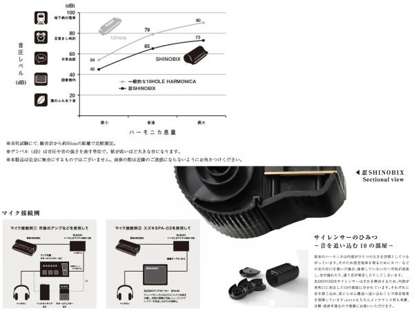 消音効果 忍SHINOBIXは強い息で演奏した際により大きな効果を発揮し、デシベル換算において平常時80~90dBの音圧を60~70dBまで軽減。各音平均で約15~20dBをカットします※。これは一般的な10ホールハーモニカの音圧を100%とした場合と比較し、約20%程度の音圧にまで軽減をしています。