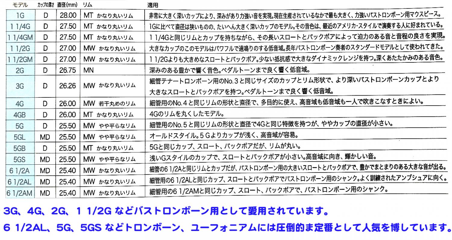 1-1/2GM D 27.00 MW かなり丸いリム 1-1/2Gよりも大きめなスロートとバックボア。少ない抵抗感で大きなダイナミックレンジを持つ。深くあたたかみのある音色。