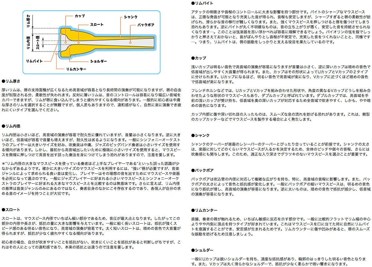 厚いリムは、唇の支持面積が広 くなるため高音域が容易となり長時間の演奏が可 能になりますが、唇の自由度が制限される分、柔軟性が失われます。反対に薄いリムは、音のコントロールは容易になり幅広い音域をカバーできますが、リムが 唇に食い込んでしまうと疲れやすくなる傾向があります。一般的に初心者は中庸な厚さのリムを選択することが無難ですが、個人差もありますので、違和感がな く、自然に楽に演奏でき疲れにくいタイプを選んでください。