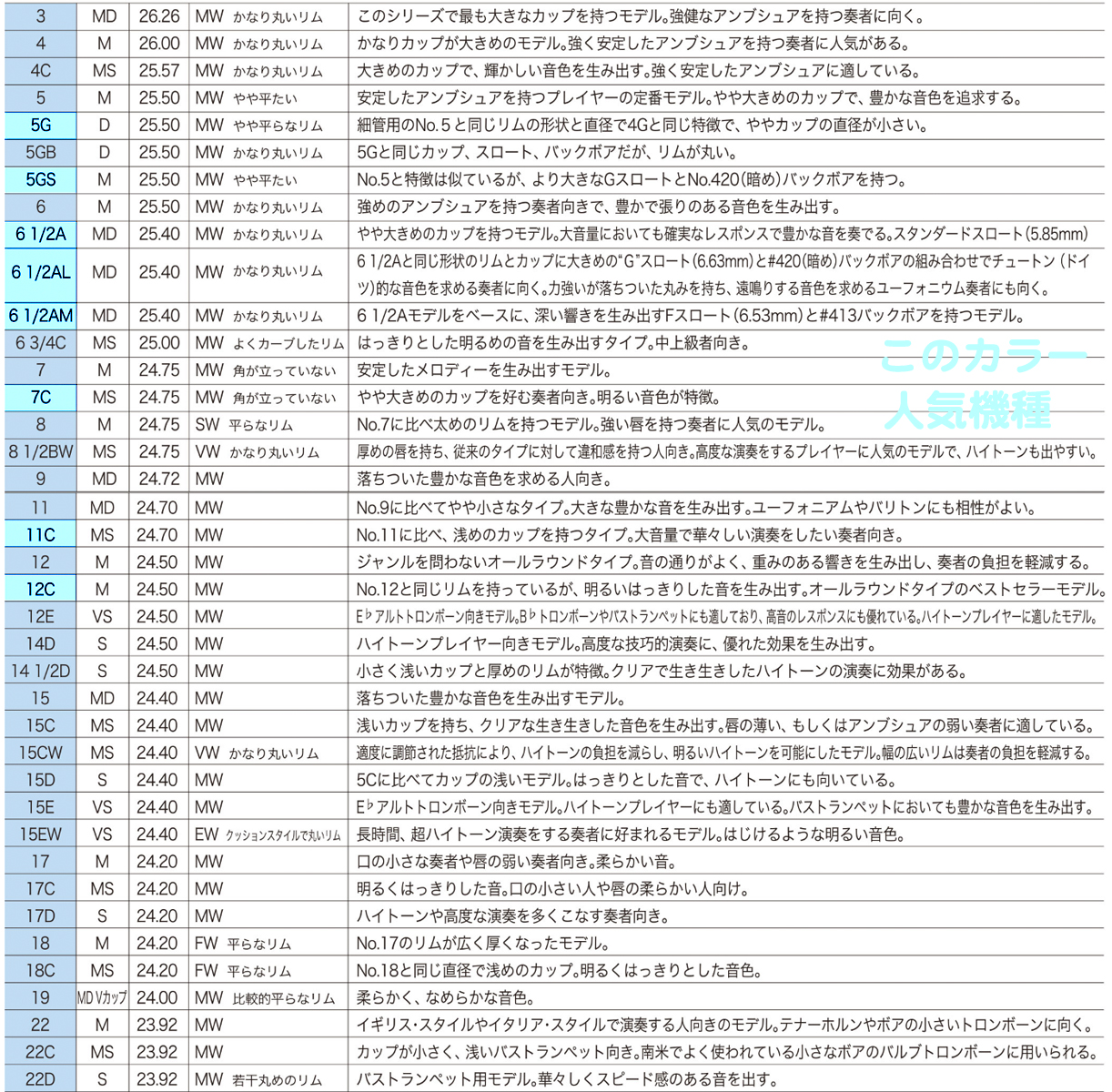 初心者はまず、一般的な一番スタンダードなもので低音から高音まで出るようになって、はじめて自分の好みや求める音色が出るマウスピースを買いましょう。