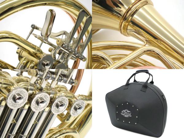 過去に複数バージョンアップを行っており、当店の販売品は新型(現行品)です。元東京佼成ウインドオーケストラのホルン奏者である木村淳氏監修の最新モデル。ベル支柱に洋白製の台座を追加し強度を上げ、より豊かな音色に。新開発のロータリーキャップでよりシンフォニックな音色になりました。これまでも可動式のF/B♭のレバーではありましたが、確実に固定しやすいレバーデザインになりました。これまでのモデルから約200の軽量化に成功し小学生/中学生に /女性の方にもより扱いやすいです。
