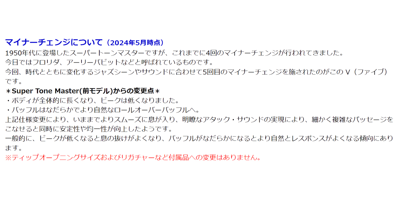 上記仕様変更により、いままでよりスムーズに息が入り、明瞭なアタック・サウンドの実現により、細かく複雑なパッセージをこなせると同時に安定性や均一性が向上したようです。