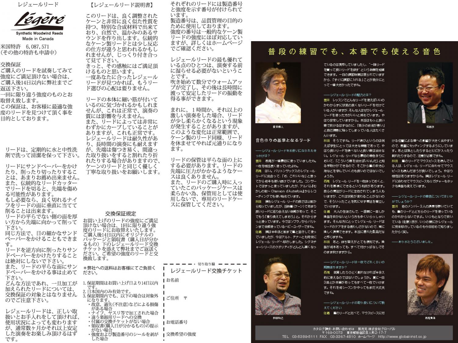 「交換チケット」に内容を記載のうえ「購入証明書」「パッケージに入れたお手持ちのレジェールリード」の3点を同封のうえ「株式会社 グローバル」まで郵送して下さい。
