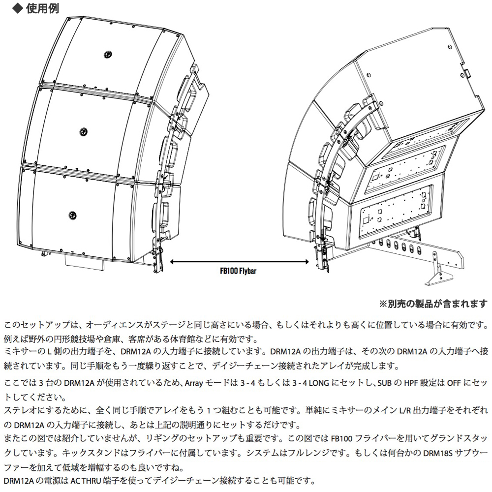 ・最大でDRM12Aを4本連結しフライング設置が可能なFB100フライバー、さらにサブウーファーDRM18SにFKDRM18Sフライングキットを取り付けることにより最大でDRM12Aを4本とDRM18Sを2本連結しフライング設置が可能