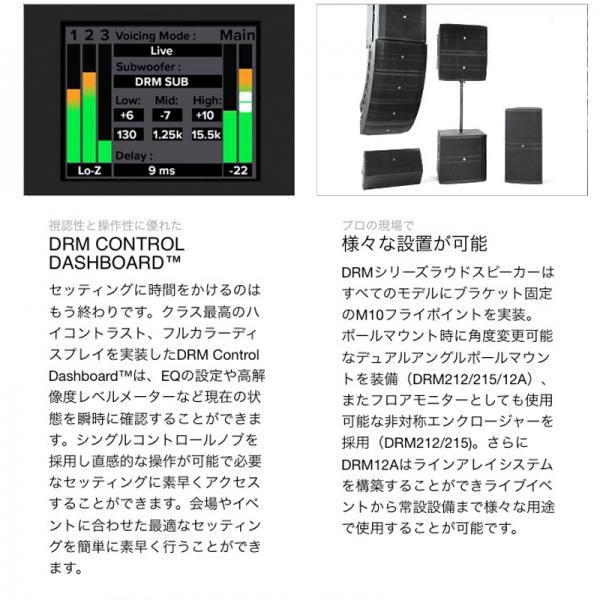 DRMシリーズパワードラウドスピーカーはクラス上位のハイパワー出力とAdvanced Impulse DSPを搭載し会場や用途に合わせて最適なサウンドを再生します。背面パネルにはDRM Control Dashboardを搭載。クラス上位のハイコントラスト、フルカラーディスプレイを備えており、誰でもすばやく簡単に現場に合わせたセッティングが可能です。