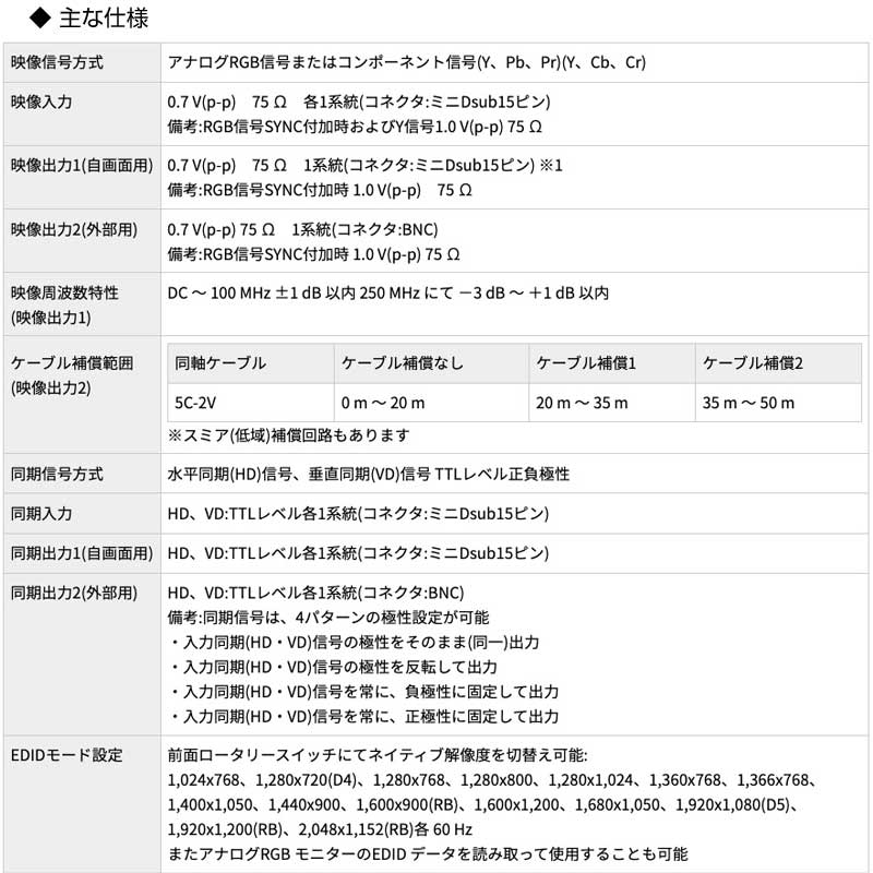 ANALOG RGB OUT2 はケーブル補償回路を内蔵しており、5C-2V 相当のマルチケーブルを使用した場合、広帯域アナログ映像信号を50 m まで高画質で伝送可能です。