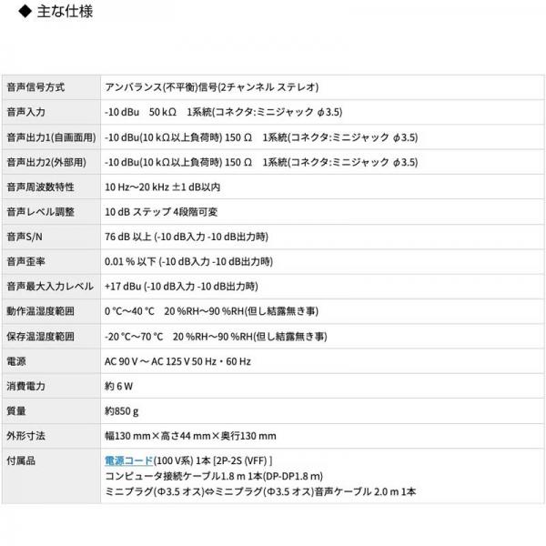 音声回路は、アンバランス2チャンネル構成(L、R)。入出力コネクタは、ミニジャックφ3.5を採用。