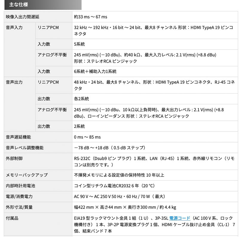 48 kHz・24 bit、最大8 チャンネル、形状:HDMI TypeA 19 ピンコネクタ、RJ-45 コネクタ |