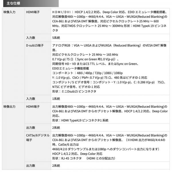 出力解像度480i ~1080p・4K60/4:4:4、VGA ~ UXGA・WUXGA(Reduced Blanking)の
