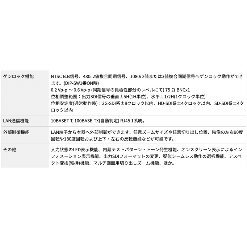 CRO-H2SCは、HDMI(DVI)信号を、SMPTE 規格の3G/HD/SD-SDI信号へ全自動変換するスキャンコンバータ機能付きの変換器です。予め設定しているSMPTEの各種SDIフォーマットへ全自動変換して出力します。IMAGENICS社製のHDMI(DVI)スイッチャーでの切替え時は、フリーズ型などの疑似シームレス効果で映像を繋ぐことができます。アナログステレオ音声のエンベデット・デエンベデット機能や、ゲンロック機能(位相調整可能)、LAN端子からの拡大縮小ズームほか各種外部制御にも対応しています。