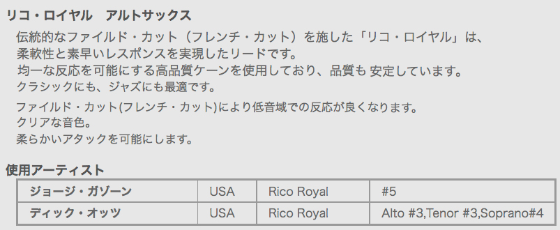 ・RICO Royal:リコの仕様を基本に、ファイルドカットを施しました。手頃な価格が魅力でクラシックからジャズ奏者に広く人気のある商品です。強度も幅広く設定し、奏者の選択肢を広げています。柔軟性と素早いレスポンス。ファイルドカット。
