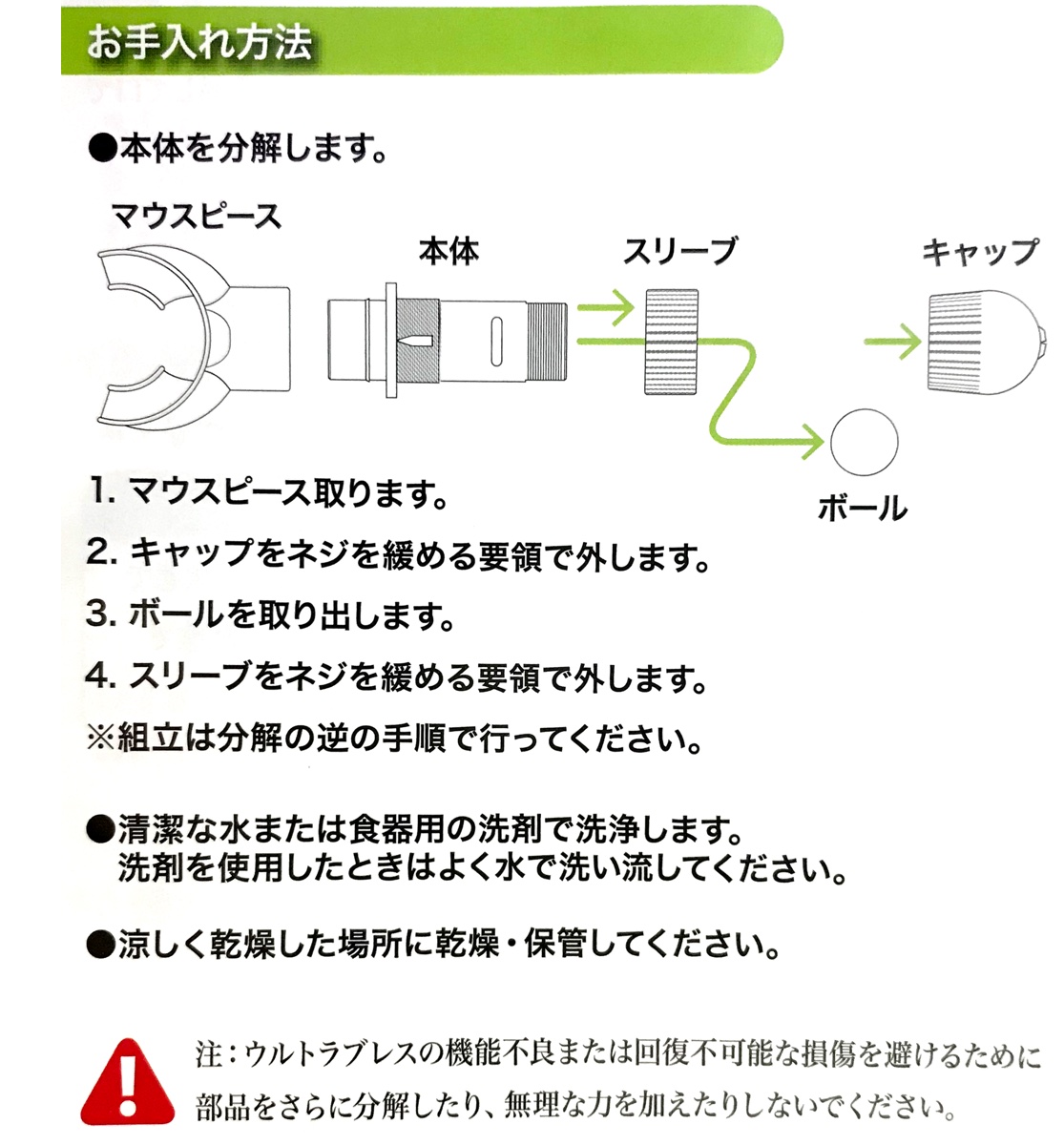 ▼バブルボールをオープンにする。 ・ウルトラブレスを縦(マウスピースが上)にする。 ・キャップをまわしバルブボール窓から少しのぞく程度の位置に調節します。(時計回りで上、反時計回りで下にいく)