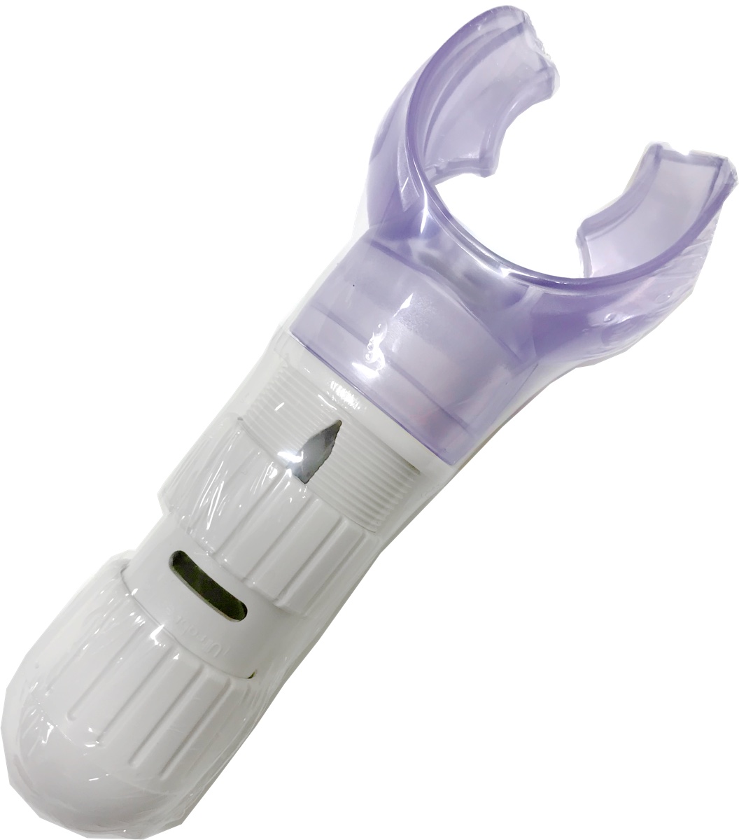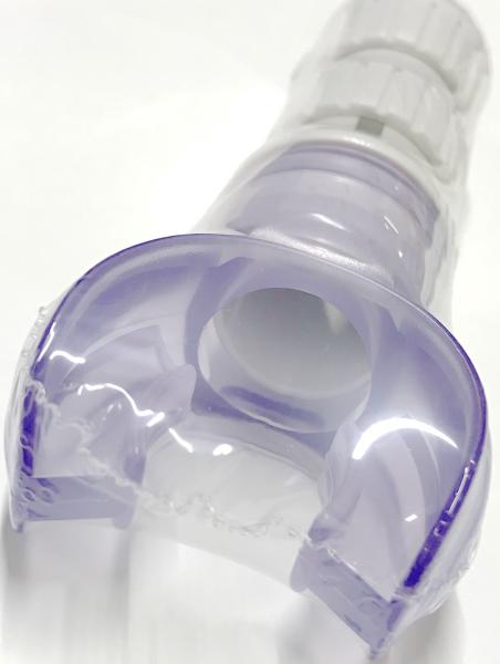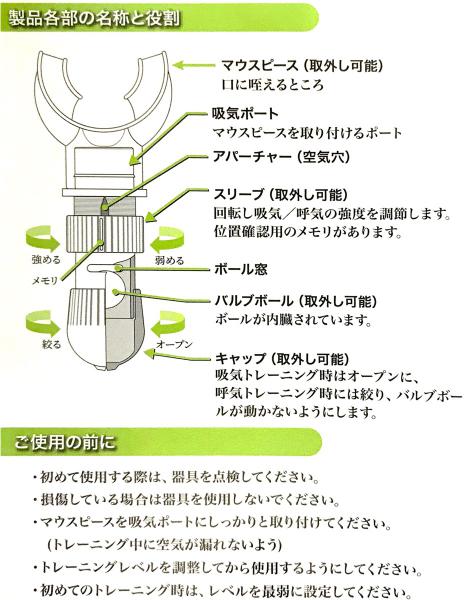 ▼息を肺がカラになるまで今度はゆっくりとはきます ※呼吸の度にカタカタと音がなりますが、バルブボールが移動する音ですので異常ではありません。 ※マウスピースが外れないようにしっかりとマウスピースの内側を噛むようにして下さい。