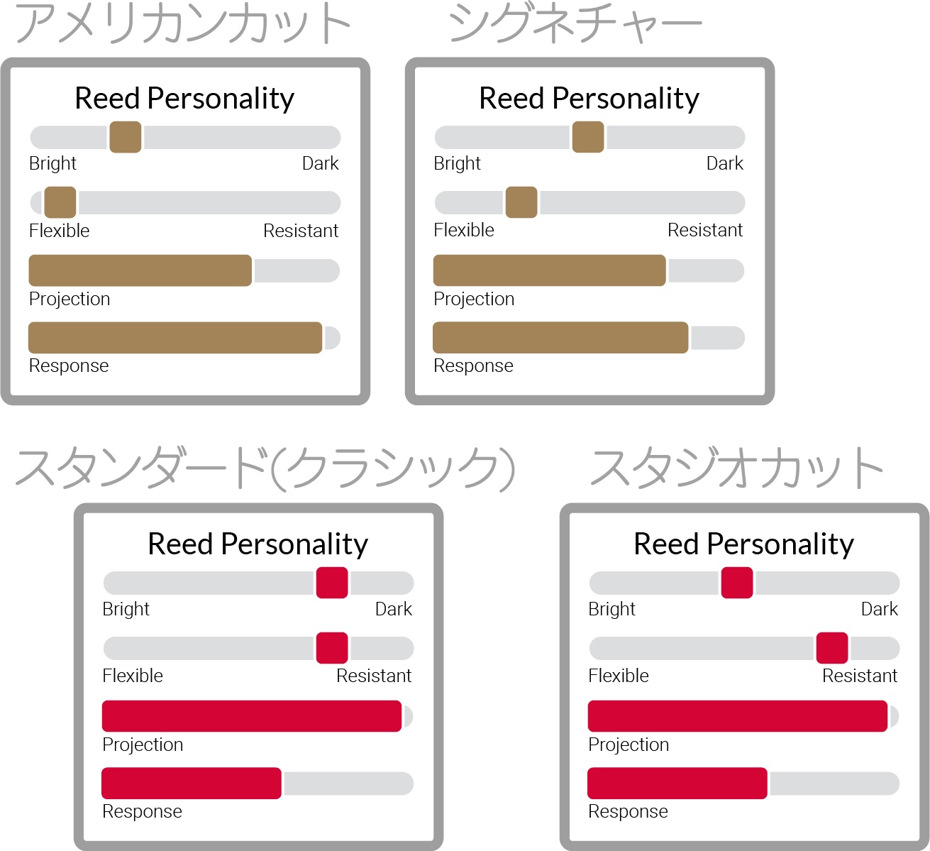 ・スタジオカット...スタンダートと同じグレードの製品ですが、サウンドにビブラートを多く使用したり、非常に激しく吹いたりするプレーヤーにとっておすすめで、いわゆるジャズ奏者向けに開発されたリードです。レスポンスがよく、コンボ、フュージョン、ポップス、ビッグバンドなど、あらゆるジャンルに対応しています。薄めが好まれる傾向にあります。